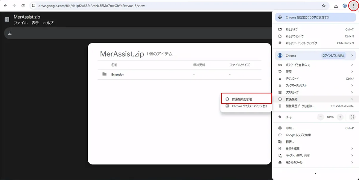 3. 「拡張機能」→「拡張機能を管理」を選択します
